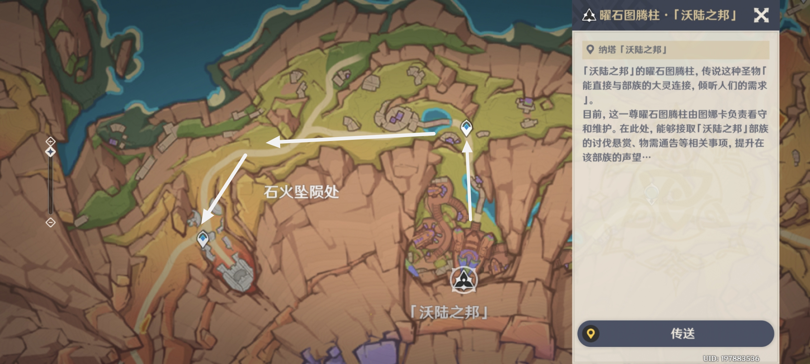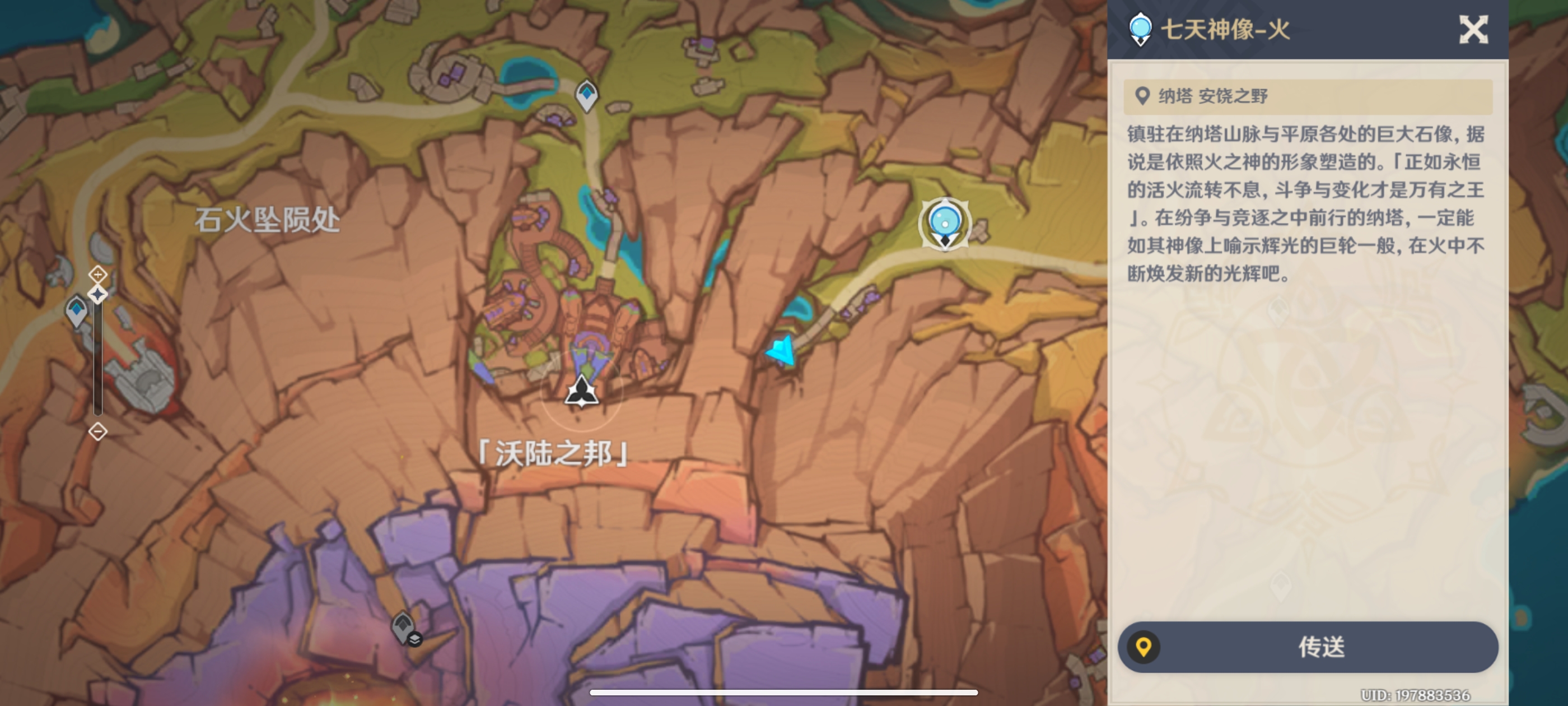 首先,传送至圣火竞技场西南方向传送点,我们朝西南方向的沃陆之邦七天神像前进,获得火神瞳*1