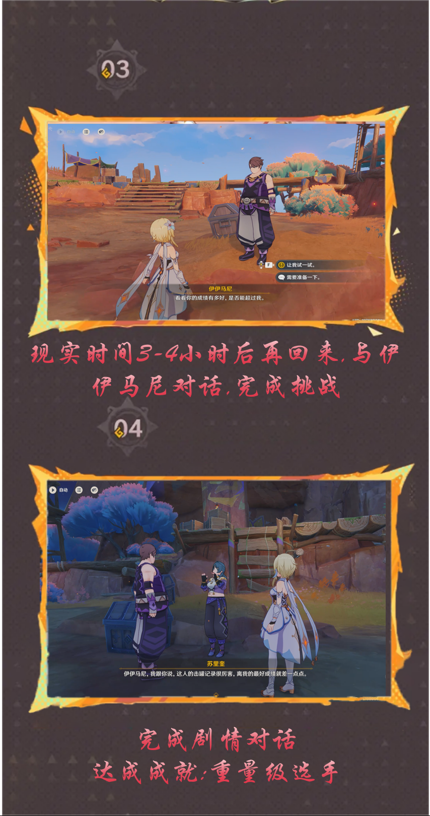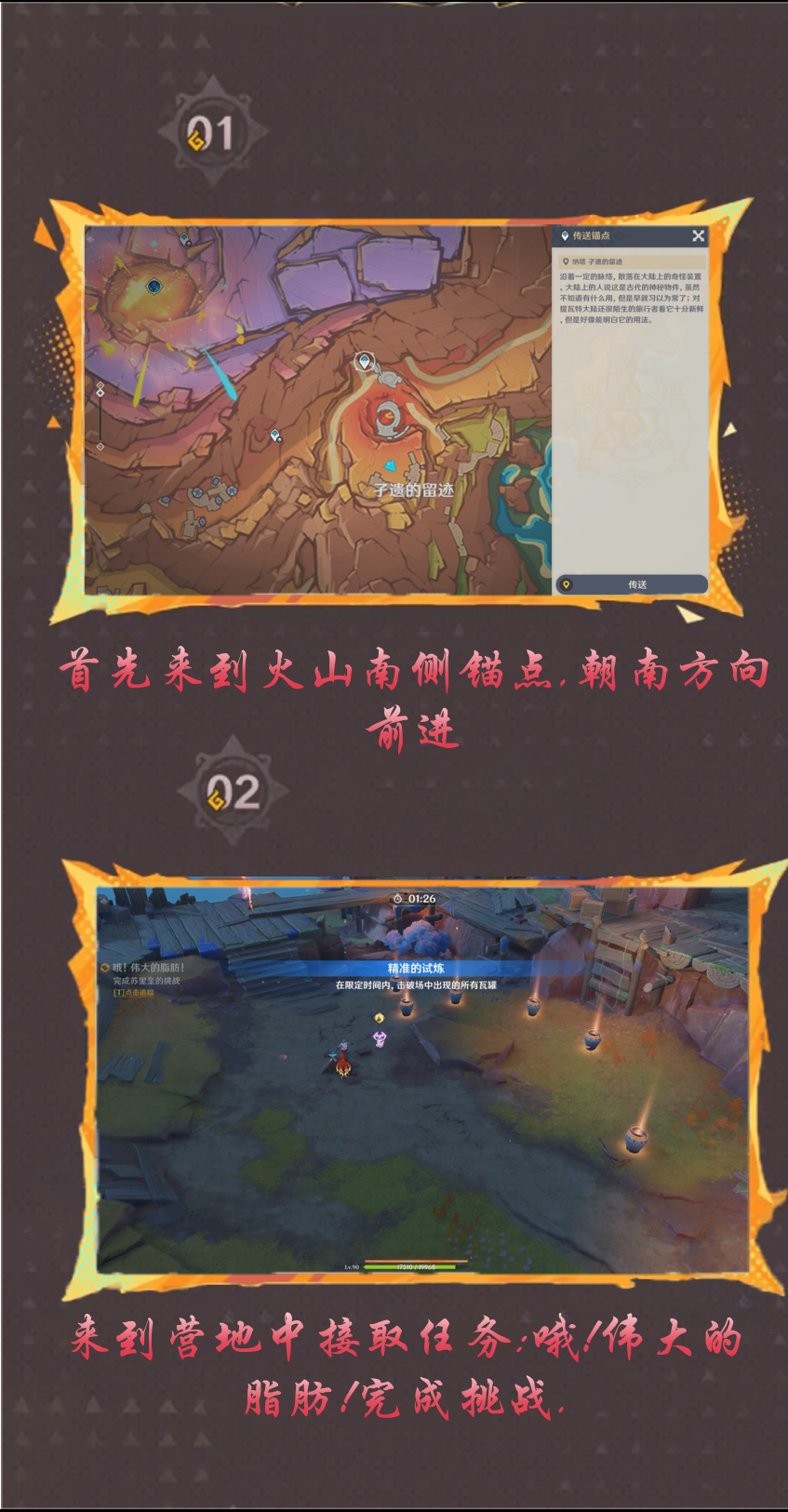 成就前引:旅行者和派蒙在火山南侧遇到了健身的苏里奎和伊伊马尼......