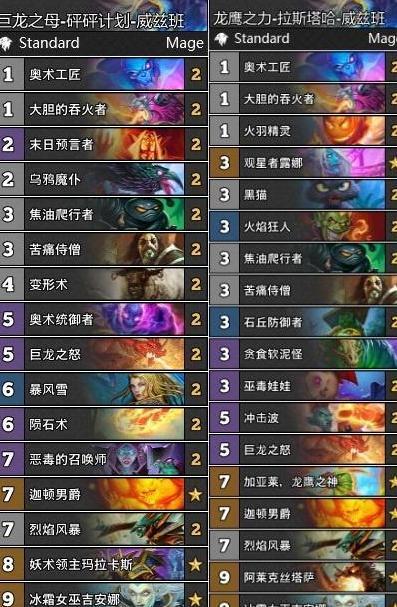 法师:巨龙之母就是带奥术统御者的龙妈法,意外是带了恶毒的召唤师。这套卡组加入了新橙卡妖术领主马拉卡斯,战吼可以补手牌,就是复制你起手的卡牌置入手牌。由于控制法缺少过牌,这张牌补手牌的效果还是不错的。龙鹰之力则是带了龙鹰之神的奇数法,起手英雄技能2点伤害,很容易打出8点伤害来。龙鹰之神就可以用战吼召唤出大螺丝了。