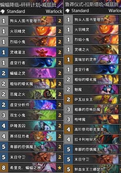 8.术士:蝙蝠降临就是把治疗园加厚了一些,去掉了治疗组件,加入了蝙蝠之神和DK,成了中速卡组。蝙蝠之神铺一波,DK铺一波,这两波你挺过去就赢了。鲁莽仪式就是弃牌术,带咆哮魔不带变节你怕不怕?