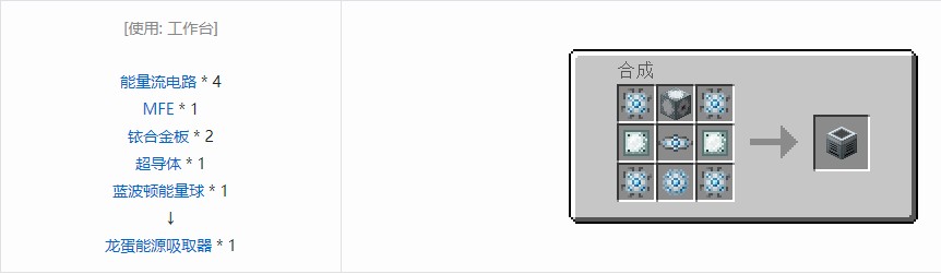*至少2.27.1.1076版本以上,可由1个MFE,4个能量流电路,2个铱合金板,1个超导体和1个蓝波顿能量球在工作台中合成。