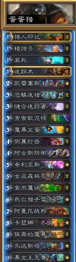 新卡乌达斯塔都快成猎人的专属卡牌了,太容易超杀,而且基本都能出拉出魔暴龙或是暴龙王,简直不要太赚。当然,带一张阿曼尼战熊也是不错选择,7费5/7的身材已经勉强可以啦,而且还有突袭效果。