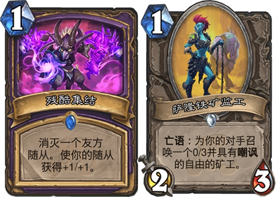 所以,知道为什么这套卡组能上传说了吧?不过,平民玩家也别担心,这套卡组新卡不多,满打满算也就残酷集结、萨隆铁矿监工这两张。就算你再穷,也不可能两三百尘都没有吧?而且这两张一费卡是真的很强。