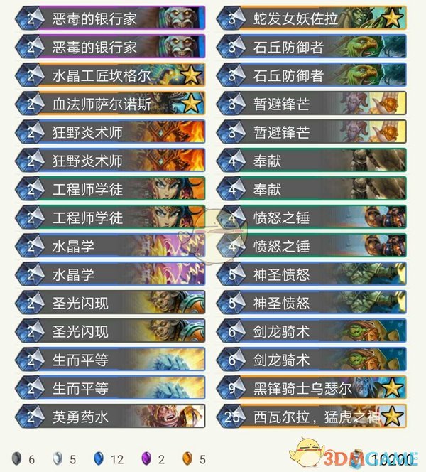 到目前为止,已经有人用这套骑士打出了12-1的成绩,基本策略是等到牌库过空,银行家洗猛虎之神,再利用神圣愤怒打超高伤害,完成这个条件需要足够多的过牌和回血清场,所幸骑士并不缺这些。