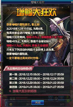 最后要说的就是增幅大狂欢了,活动从12月15日开始,为期4周。活动只有在周末才会开启(元旦期间活动持续4天),活动期间增幅+6为止,数值不会下降!增幅+8失败数值不会初始化,最重要的是增幅+11失败武器不会碎,小伙伴们可以冲击红11了!活动期间登录可获得一个增幅祈愿珠,也可以在克伦特商店中消耗5w金币购买。