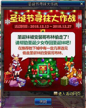 圣诞节寻袜大作战与往年一样,进入推荐地下城中击杀地下城中的怪物概率掉落丢失的圣诞袜,300个丢失的圣诞袜可以在赛利亚旅馆中的NPC圣诞少女的商店中兑换圣诞树武器装扮,同时游戏商城中可能会出售圣诞装扮礼包。