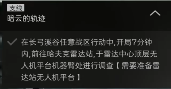 在长弓溪谷任意战区行动中,开局7分钟内,前往哈夫克雷达站,于主楼顶层无人机平台机器臂处进行调查,需要准备雷达站无人机平台的房卡。