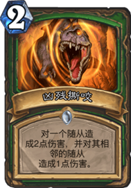凶残撕咬这张卡牌虽然现阶段的猎人并不看好这张卡牌,但因为我们的抗快攻能力有待增强,而现阶段该有的快攻(奇数贼 奇数骑 治疗园 动物园)都有许多1-2血的随从,至此我们可以作为一张单解去替代这张卡牌。喜欢的大神们可以适当替代一张,替代卡位为奥秘图纸。