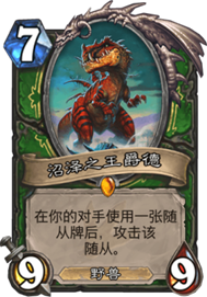 王爵德,这张卡牌同样也是野兽属性,当我选择了665狮子,其1是因为狮子比起王爵德站的住场面,656亡语召唤2个22的土狼,但王爵德除了身材好就没有其他用处了,而且曲线相对狮子而言也并不顺滑,所以我们选择狮子不选择王爵德的原因,但王爵德也有好的地方,那就是在猎人后期有场面的时候特别厉害,大神们可以根据卡牌来进行取舍 取舍为长鬓草原狮—王爵德。