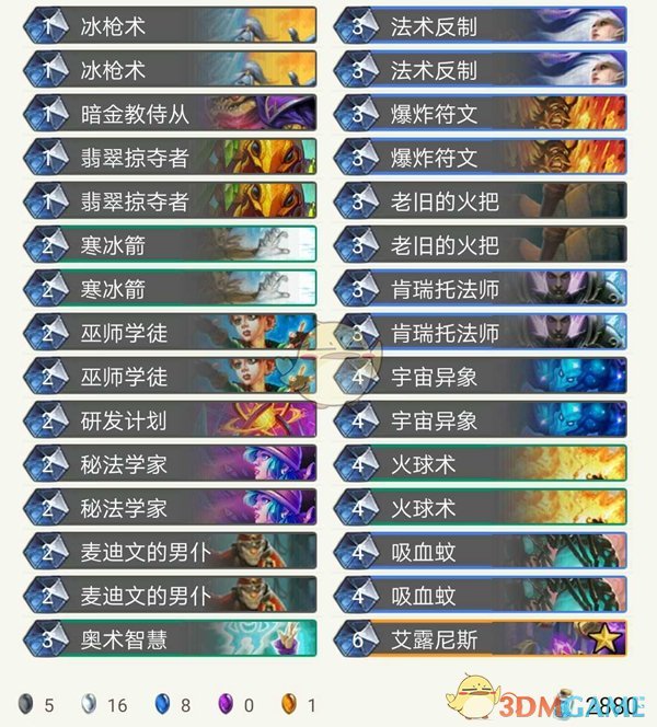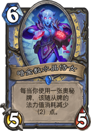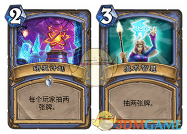 在资源富裕情况下可以换成血法师萨萨萨萨尔诺斯,因为艾露尼斯奥秘法又一个很大的缺点就是手牌用的快,艾露尼斯迟迟不上手就意味着GG,所以我选择带上一定的过牌来保证手牌资源足够。这两张牌各有优缺点:研发计划效果共享,意味着我们使用这张牌的时候会帮助对方寻找存活机会,但是费用很低,配合哀绿甚至能1-0费过两张,要是对面是奇数贼的话那么这张卡就相当于没什么副作用了;奥术智慧费用偏高但也算优质过牌有益无害,因此各带一张,假如有血法师,优先替换研发计划。