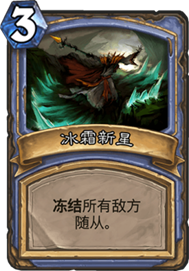 没错,你没看错,就是冰环,在6-5这个分段偶数萨奇数贼数量实在是太多了,笔者去掉了一张宇宙异象一张翡翠/121侍从换成了两张冰环,尤其是面对贼的时候,四费哀绿加冰环冰枪保场面强行打脸冻人冻随从,强行蹭血制造斩杀机会,遇到了4把奇数贼3把弑君贼全是这么死的,面对偶数萨总共6局,其中4局对面相当于是叫杀了,活生生给冰了两回合最后被我们高额的斩杀带走,所以别只认为这是慢速卡组的单卡,面对站场型卡组时,这张卡是有奇效的。但是不建议和笔者一样骚包一样极端满编。