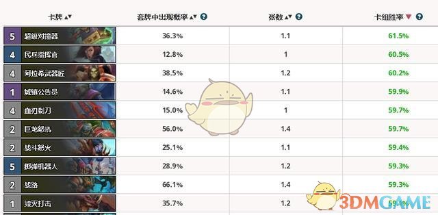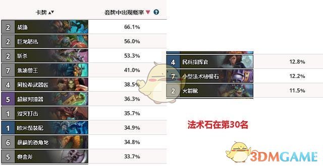 战士竞技场套牌持有率前10的卡,法术石在第30