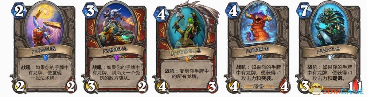战士本来就不是一个注重2费曲线的职业,之前2费一般都开熔炉或者转甲,有这个之后2费有别的事干,补充手牌质量非常不错;而且最重要一点龙卡之间的配合很多(比如牧师433破晓龙,新出的中立774看台喷火龙),很容易互相发动效果打崩对手。每次都来两张,麻麻再也不担心我卡梅隆了!