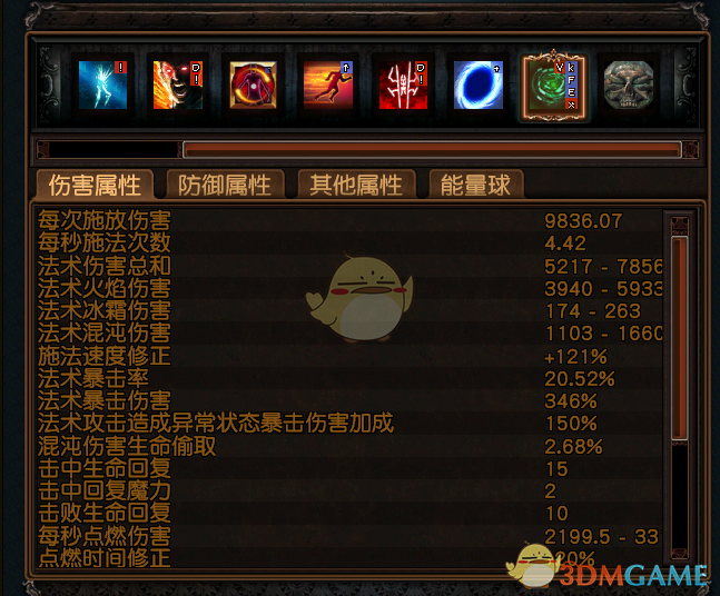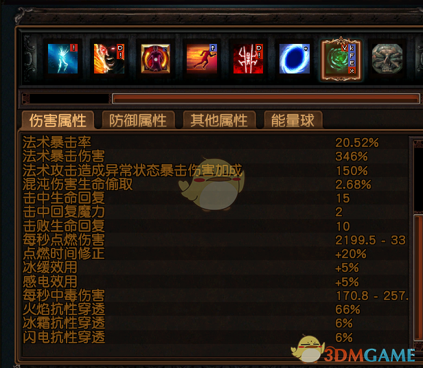 首先是手套加憎恨转伤三相做到60%物理伤害转换为冰霜伤害(不太清楚是否可以超过60%,又懂得大佬可以来解释一下),然后天赋点物转冰将剩下40%物理伤害转换为冰霜伤害,达成100%物转冰(带冰冷之眼手套没有憎恨转伤活力回血三相的朋友们是天赋40%加手套50%,达成90%物转冰)。技能连接了寒冰转烈焰将50%冰霜伤害转换为火焰伤害,然后燃焰戒指将40%冰霜伤害转换为冰霜伤害,这样就做到了90%冰转火。