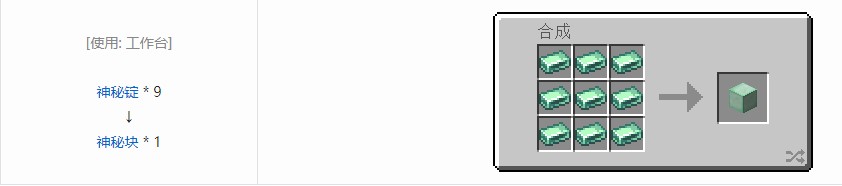 玩家可以使用9个神秘锭在工作台上合成1个神秘块。