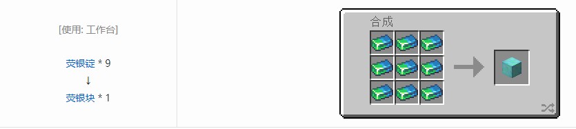 玩家可以使用1个荧银块在工作台上合成9个荧银锭。