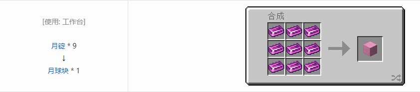 玩家可以使用9个月锭在工作台上合成1个月球块。