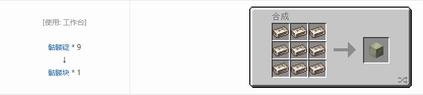 玩家可以使用9个骷髅锭在工作台上合成1个骷髅块。