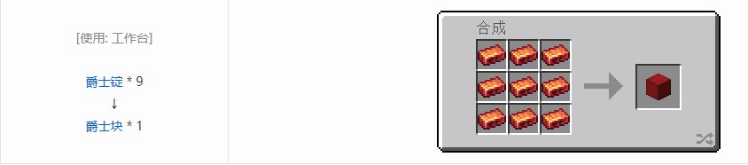 玩家可以使用1个爵士块在工作台上合成9个爵士锭。