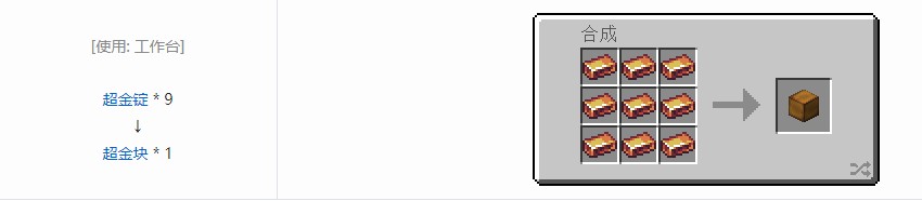 玩家可以使用1个超金块在工作台上合成9个超金锭。