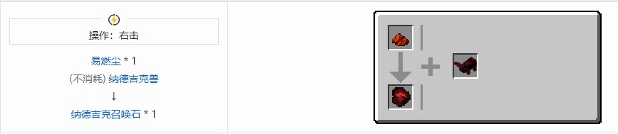 当玩家手持易燃尘右击纳德吉克兽时,会消耗1个易燃尘,并获得1个纳德吉克召唤石(相当于物品转化,不能一次转化整组)。