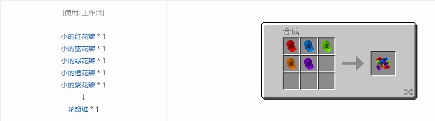 当玩家手持花瓣堆右击花瓣合成祭坛时,消耗1个花瓣堆,给予玩家水能头盔、水能胸甲、水能护腿、水能靴子中的任意一个1个,每件盔甲概率相等。