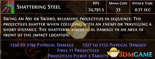 由于这是一个投射物技能,没有多次释放的机制(不能被多重打击辅助)所以,而且技能还可以堆叠穿刺层数,因为穿刺层数是没有上限,且能同时触发作用,所以攻速越快,给你带来的提升是非常明显的。多打一次等于多一次巨额伤害。不过好在,剑的基础速度普遍偏快。天赋以及珠宝可以提供大量的攻速,也是对于BD来说有很好的辅助价值,所以多多点出。