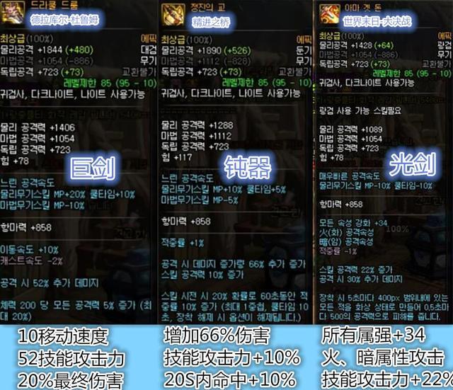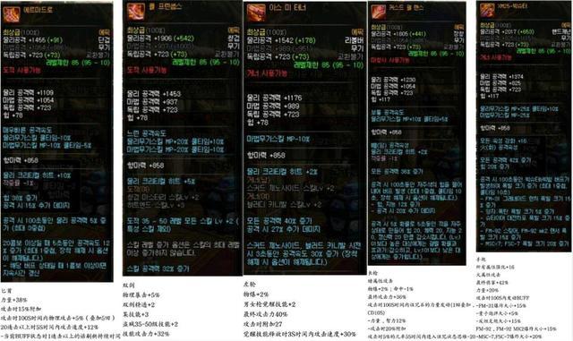 首先看看鬼剑士的普通95武器,不管哪一把的提升都十分讨喜,尤其是钝器66%的黄字以及10%的技能攻击力,这两条属性加起来提升直接达到了76%,而且还有额外的命中以及面板加成,总提升在80%以上,实战之中这个数字还会更高。其余各职业武器属性如图所示,它们大多在某一方面特别出色,全新的副本中需要的就是这样的能力,平庸的圣耀其实早已不堪一击。