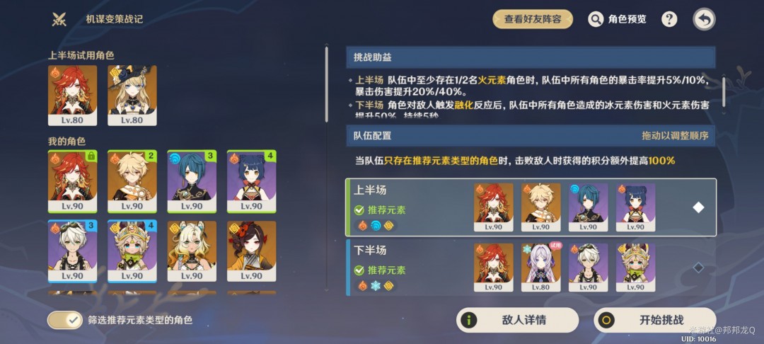 在上半,卡齐娜和班尼特要留给下半。因为火神的充能不是常规充能,所以说我们尽量要多选纳塔角色,更快的让火神能放Q,实在没其他角色的话就火主。这里有两种思路,一种是再配一个风系带风套给火减抗行秋挂水,火神打普攻。要不就是再带一个香菱和行秋,轮番打纯伤害。因为基础数值在这儿,我们肯定是够用的,看大家的配对即可