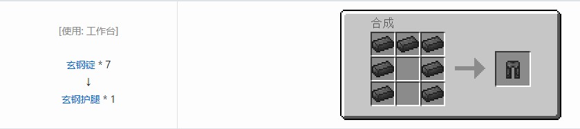 玄钢护腿是一个由玄钢锭制成的坚固的护腿。它有与铁制装备相同的保护值,比钻石稍高的耐久值,和与皮革相同的附魔能力。