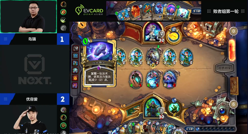 这个对局法师优势,起手也胡,有各种过牌以及小丑做任务,而萨满的手牌非常不好,过牌速度差很多,风潮前期过两张的机会也错过。萨满8费提速,下撼世者拿回苦囚,但手上卡3张AOE比较坑。法师进度遥遥领先,萨满必须拼过牌过到沙德沃克,风潮+视界术双过无果。倒是法师研发计划帮萨满过到沙德沃克,但法师任务做完,无限火球已达成,最终毫无悬念的拿下这场比赛。岛猫 2:2优容爱。
