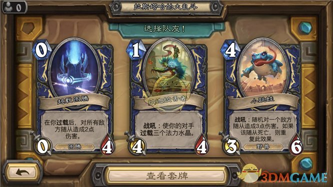 第二个boss是高阶祭司耶克里克,技能是古尔丹的生命分流,他的神龛效果是法术消耗生命而非法力值。前两关的boss实在简单,我就不多阐述了。在打完两个小boss后,会选择一个队友,如图所示,超载图腾、娜迦绞舌者、小跳蛙。我选择了小跳蛙作为新的队友。