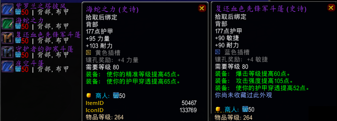 5件寒冰纹章披风中只有2件物理破甲披风值得兑换,特别是海蛇之力是巫妖王之怒版本极其稀有的力量破甲披风。
