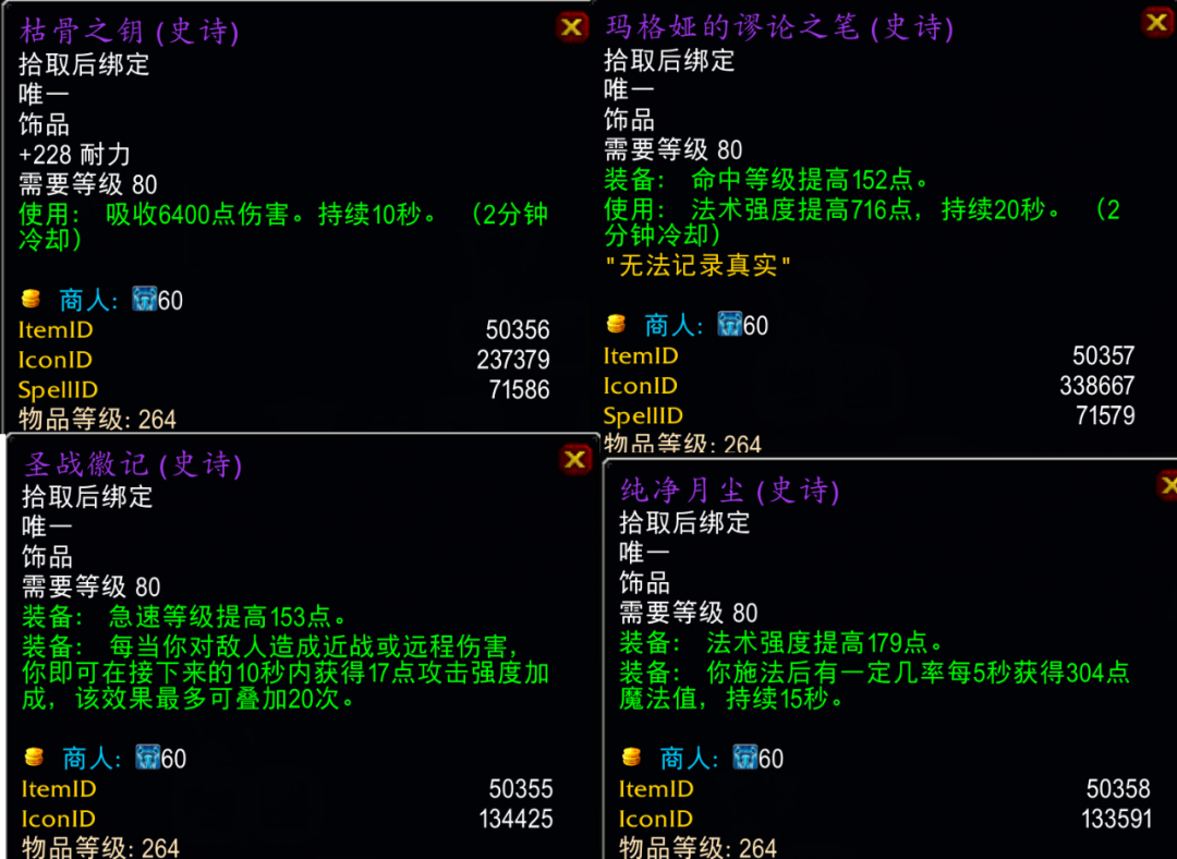 4件寒冰纹章饰品中最值得兑换的当属枯骨之钥,它是坦克职业P4阶段毕业饰品,常驻耐力仅次于辛达苟萨掉落的完美之牙,主动特效吸收盾和牧师真言术盾一样能免退条还获得很多PVP玩家的青睐。