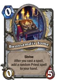 0费,0/5,神龛,当你施放一个法术后,将一张随机牧师法术置入你的手牌。