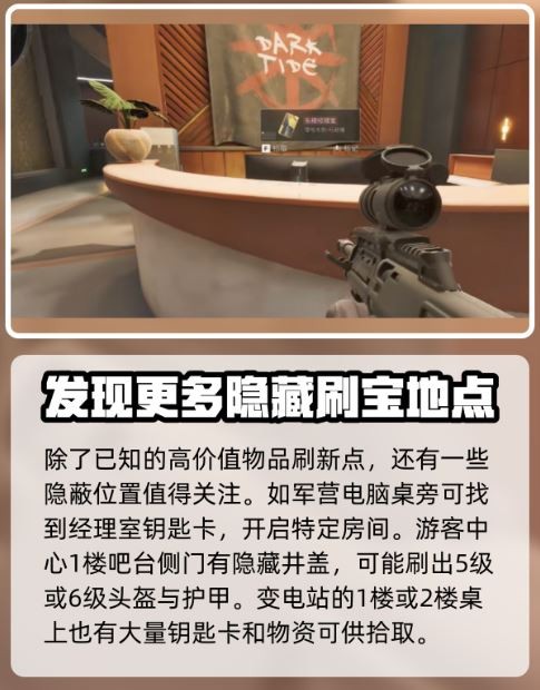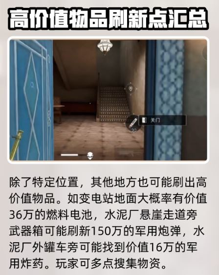 香槟超多的地方有天基地蓝室2楼、长工溪谷撤离点等等,尤其是长工溪谷,简直香槟天堂! Cement厂那边也别错过,悬崖旁能刷到150万的军用炮弹,罐车旁还有军用炸药。-hidden spot来了!游客中心一楼吧台侧门有两个井盖,能挖到高级头盔和护甲。军营电脑桌旁还可能找到钥匙卡,打开神秘房间哦!