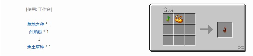 由草地之种和烈焰粉合成,可以直接对草方块 / 泥土方块使用,将周围一小片范围变成焦草草地。