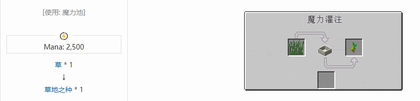 右键过的泥土会变成草方块并随机向周围蔓延(平均约 18 方块左右),也是合成材料,由草投入魔力池中消耗 2500 点魔力获得。