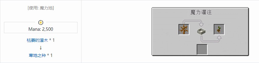 向魔力池中丢入一个枯死的灌木并消耗 2500 mana 获得,在草地 / 泥土块上使用会生成灰化土,并向周围随机蔓延,所能影响的方块也高于普通草地之种。