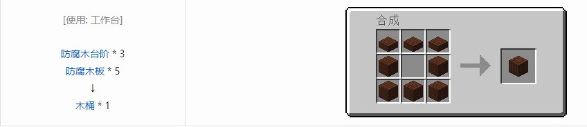 木桶是一种简单的储液容器。一个木桶可以存储 12 桶液体,但材质毕竟是木质,所以木桶并不能存储高温液体,如熔岩和烈焰之炽焱。