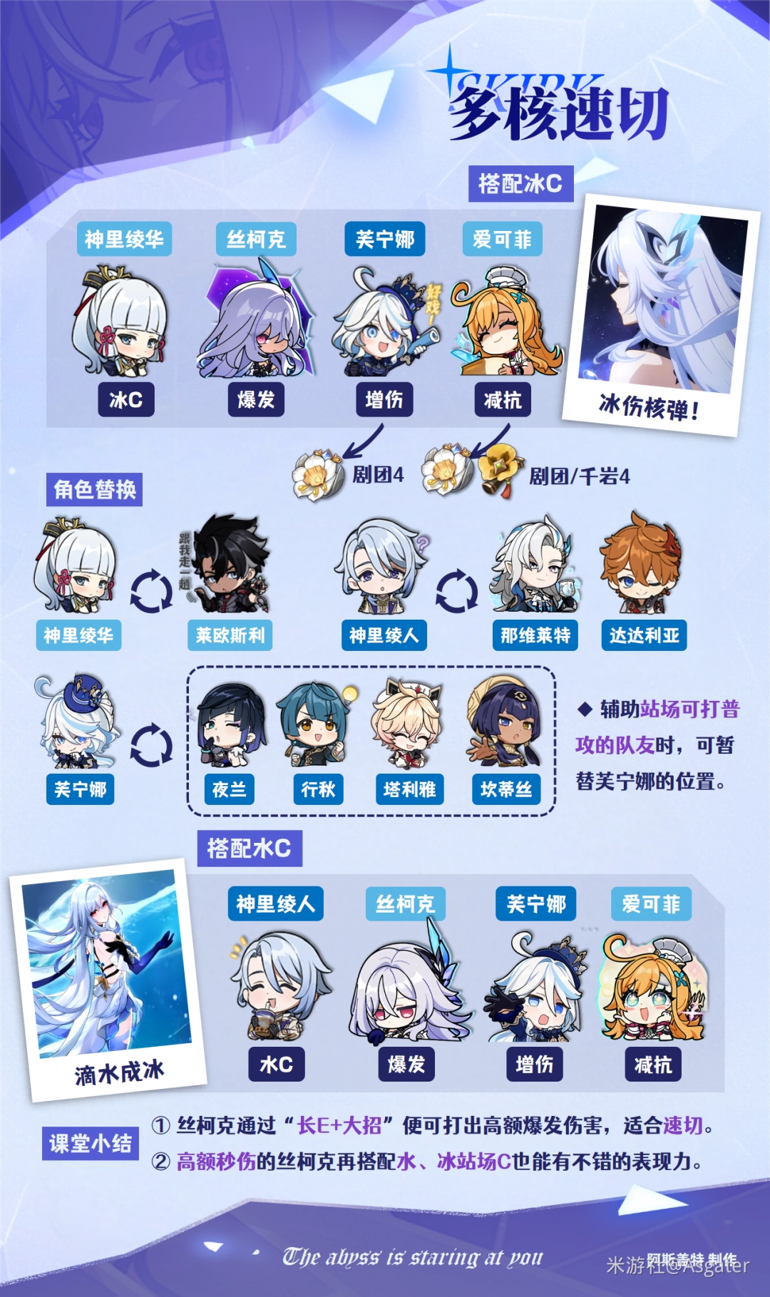 ① 引入站场水C补充大招流丝柯克的输出空挡,水C可选神里绫人、那维莱特、达达利亚等。