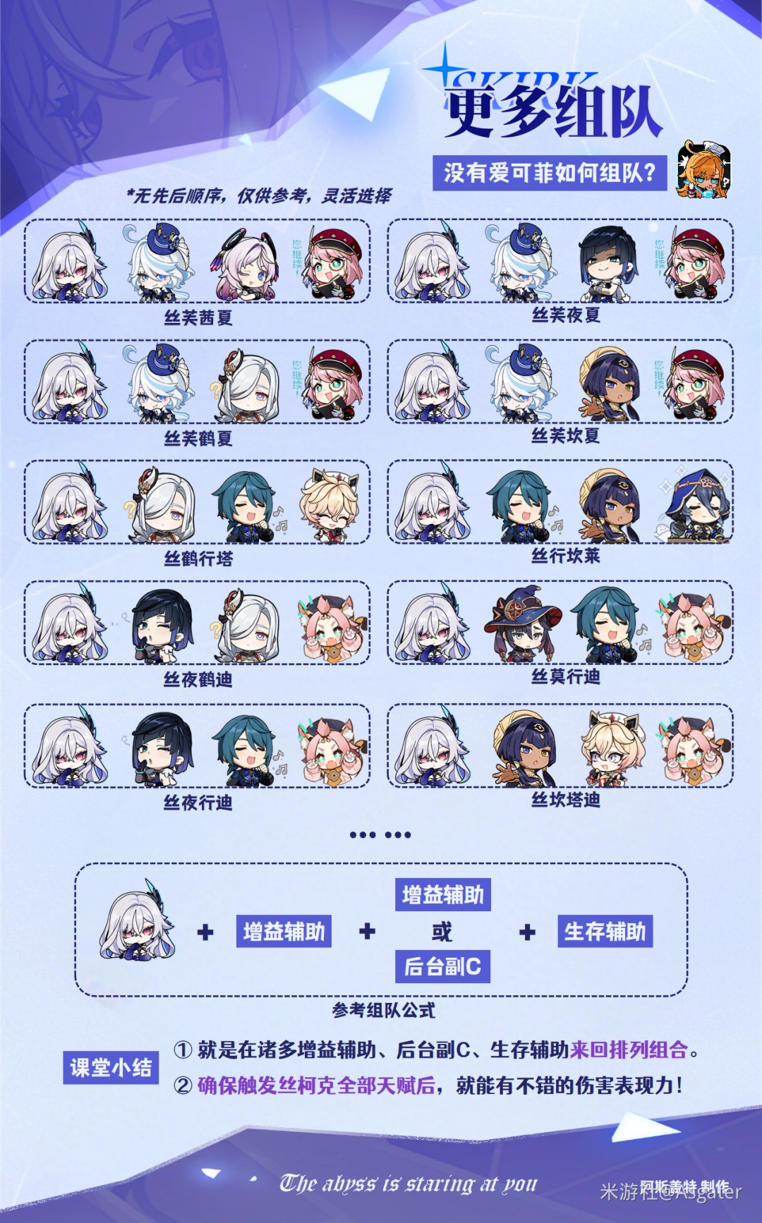 ② 队友以“提高丝柯克的大招伤害”为主,如爱可菲、芙宁娜、申鹤、莫娜等。