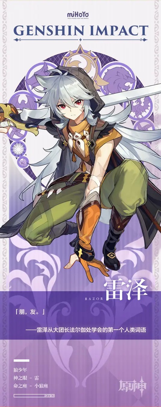 雷泽直觉锐利,身姿迅捷,凭借野兽般的直觉,在林间与狼群一起奔猎。在蒙德坊间传闻中,有人说他是被狼收养的弃婴,或者是狼灵的化身。