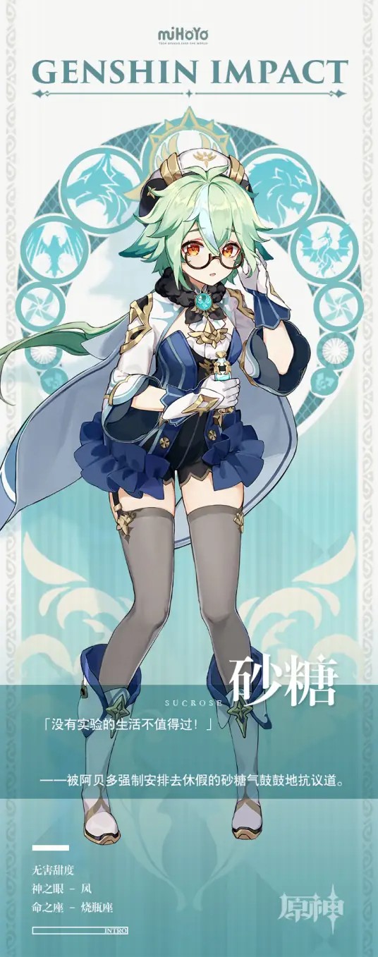 砂糖,米哈游出品的游戏《原神》及其衍生作品中的角色。对世间万物抱有强烈好奇心的炼金术士,隶属西风骑士团,是阿贝多的助手。研究方向为“生物炼金”。她希望用炼金术改造既有的生命形态,让这个世界更加丰富多彩。虽说改造过程中偶尔会出现一些过于奇异的产物,但总体而言,砂糖在“生物炼金”方面成就斐然。