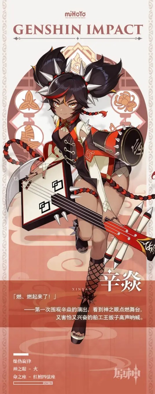 辛焱,米哈游出品的游戏《原神》及其衍生作品中的角色。在璃月港,摇滚属于新兴艺术,辛焱则是这门艺术身先士卒的践行者。她用音乐和热情歌颂着对“成见”的反抗,想要唤醒劳于世间昏昏沉沉的灵魂。