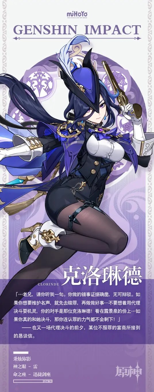 克洛琳德,米哈游出品的游戏《原神》及其衍生作品中的角色,枫丹“最强”的决斗代理人,以手中的剑维护着枫丹廷的“公义” 。人人都知道这位不败的决斗代理人的大名。在她的剑下,任何伪装成正义的卑劣言行,试图钻营的侥幸心机都会现出原形。在“代理决斗”中,她从无败绩,是愚人众执行官“公子”达达利亚渴望切磋过招的对手。
