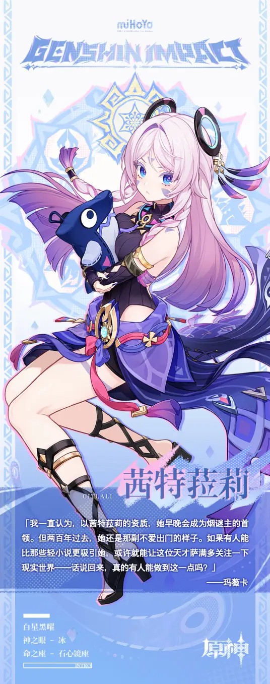 茜特菈莉,米哈游出品的游戏《原神》及其衍生作品中的角色,米克特兰的观星者,烟谜主的大萨满,有着“黑曜石奶奶”之尊号的强大暝视者,令所有族人敬畏的大前辈。是绝对不可招惹的狠角色,但也是遇到疑难问题时的最佳求助对象。