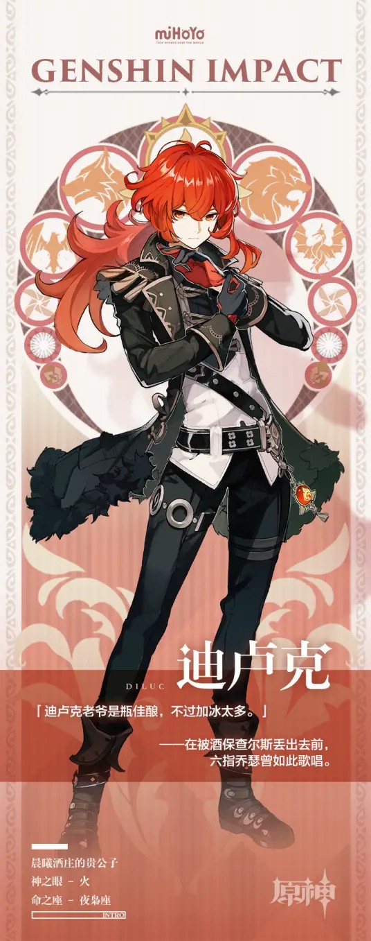 迪卢克·莱艮芬德,米哈游出品的游戏《原神》及其衍生作品中的角色,蒙德城最大酒庄“晨曦酒庄”的庄主,蒙德商会首席,原西风骑士团骑兵队长。迪卢克掌握了蒙德的酒业之半,同时也掌握了蒙德金钱的流动脉络与酒馆的闲言碎语。某种意义而言,称得上是无冕的蒙德之王。