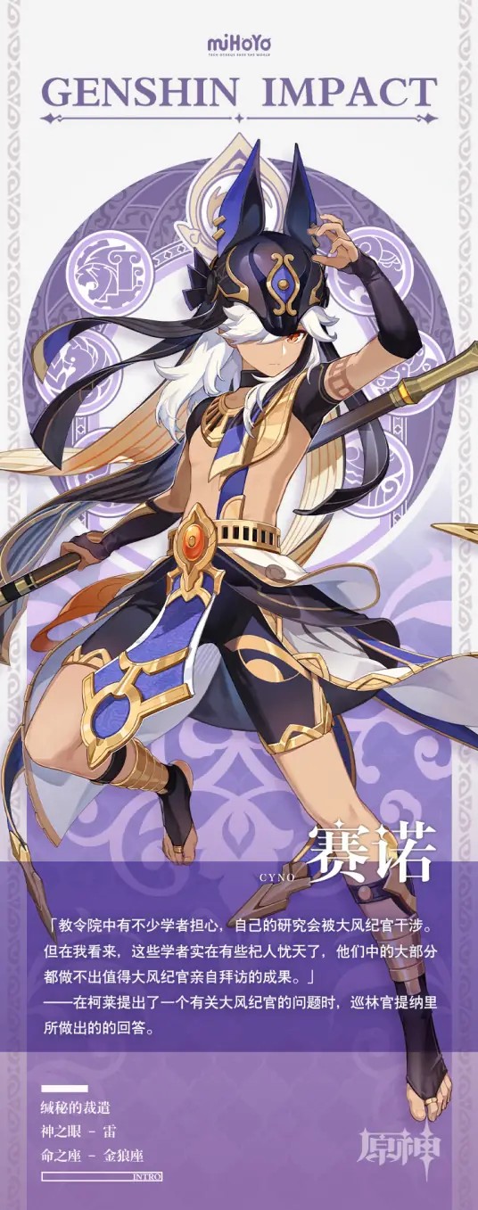 赛诺,米哈游出品的游戏《原神》及其衍生作品中的角色,须弥教令院的大风纪官,所有风纪官们的首领。拥有的独特幽默感令人印象深刻。炽沙、深窟、激流、峭壁…大风纪官的足迹无处不在。因为在履行职责时,赛诺的坚持就和他的幽默感一样可怕。