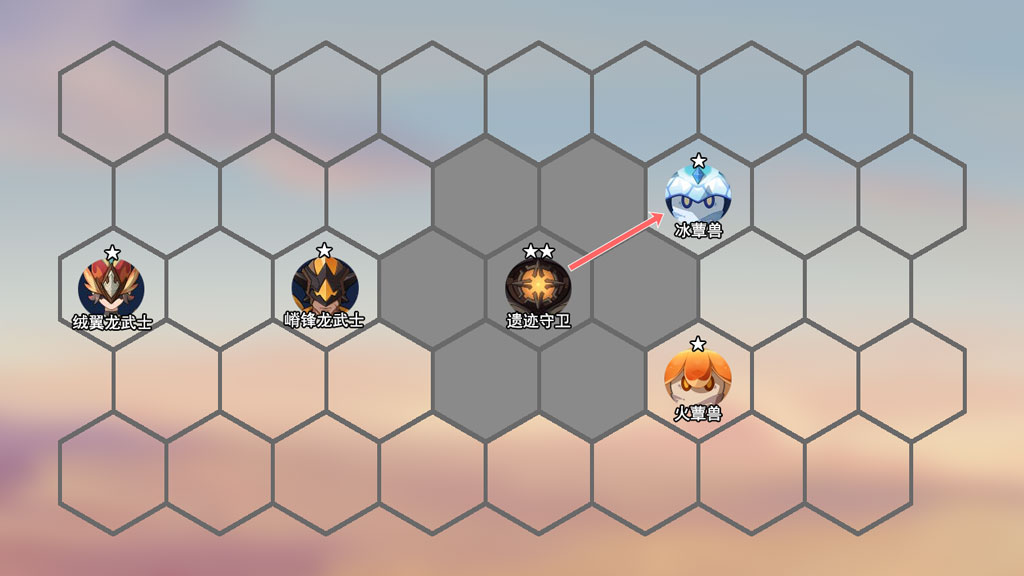 ●1-6的战斗非常简单,只有一个遗迹守卫。将远程棋子靠边,近战棋子紧贴守卫吸引仇恨即可: